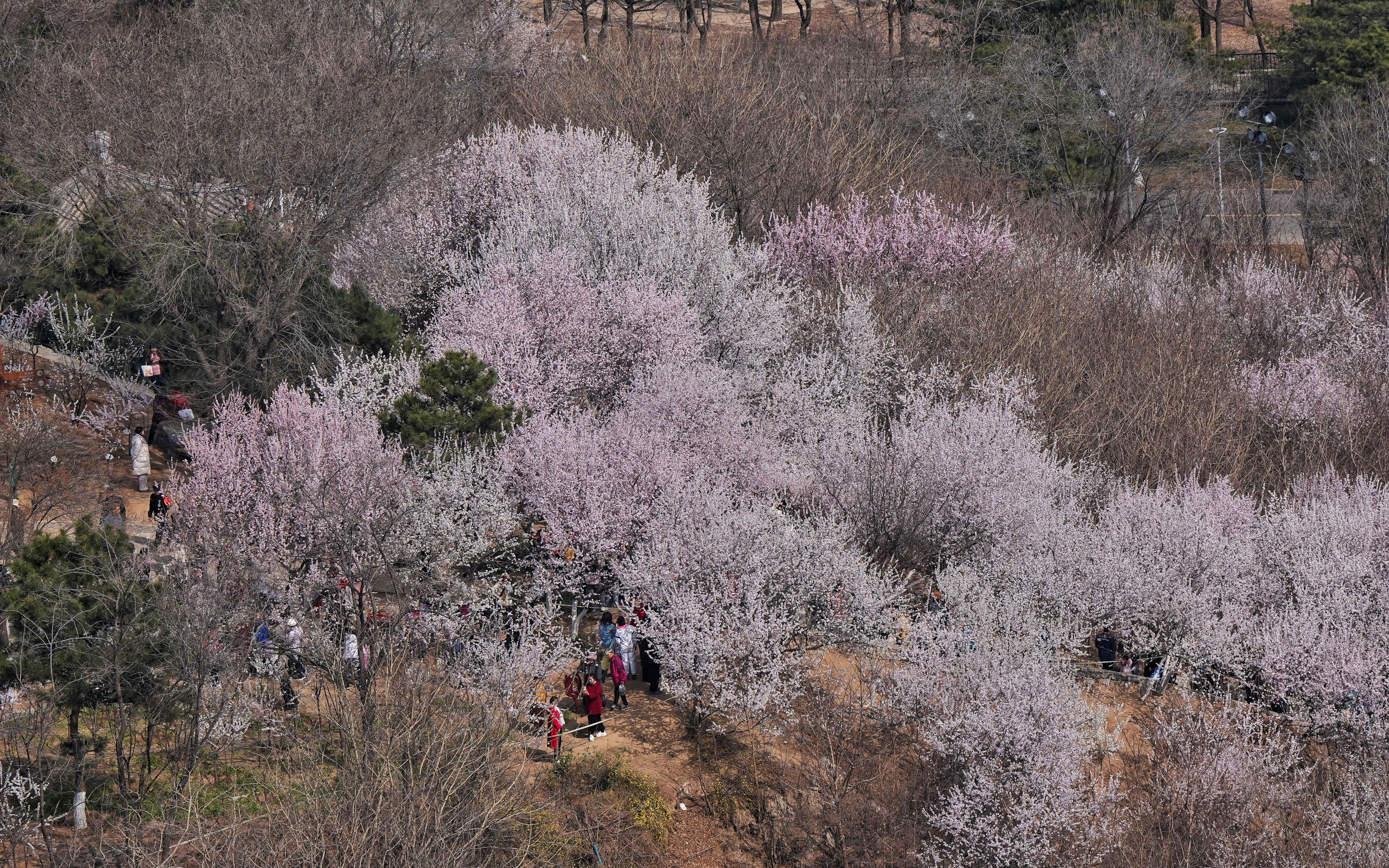 春日时节,鹰山桃花竞相绽放。目前,桃花谷开花率已达八成,山桃花沿山谷连绵绽放,粉白花海如云似霞。游客们也可登上永定塔,俯瞰花海。